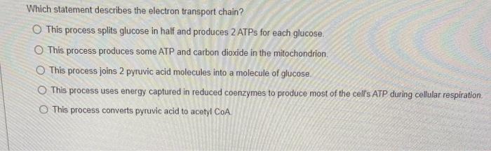 Which statement describes the citric acid cycle. 2 The citric acid cycle produces most of the ATP that is subsequently used by the electron transport chain. Many bacteria perform the.